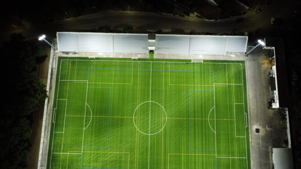 O projeto contou ainda com o reposicionamento das colunas de iluminação nos cantos do campo, aproveitando a elevada performance dos equipamentos instalados a uma cota superior. A tecnologia patenteada das lentes AAA-LUX direciona a luz exatamente onde é necessária, maximizando eficiência e reduzindo desperdícios luminosos.